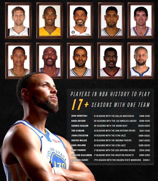 忠诚!库里即将成为历史第10位为“一支球队”效力17年的球员!