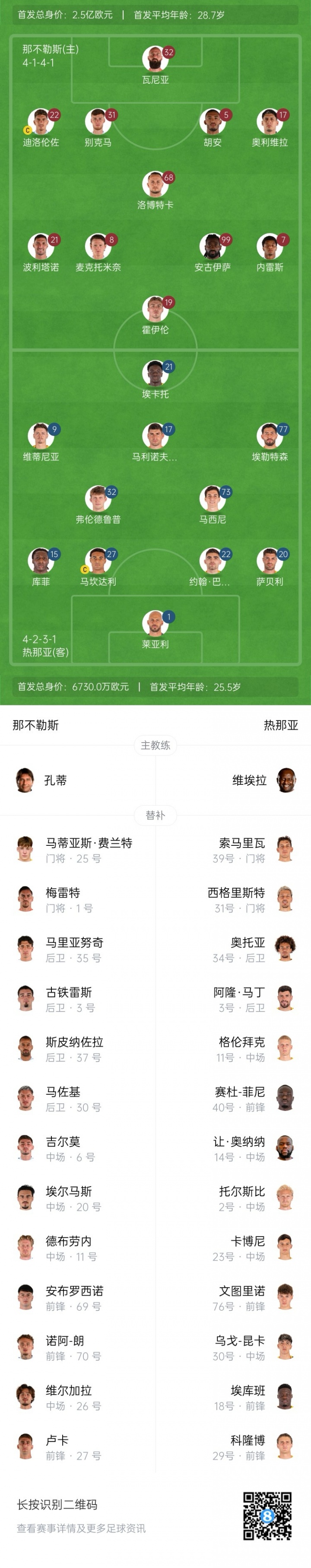 那不勒斯首发:32-瓦尼亚、22-迪洛伦佐、31-别克马、5-胡安、17-奥利维拉、99-安古伊萨、68-洛博特卡、8-麦克托米奈、21-波利塔诺、19-霍伊伦、7-内雷斯